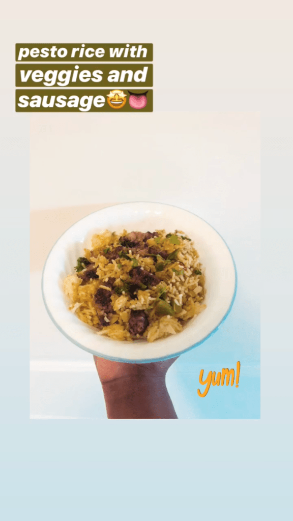 Alright, ready to get your chef on? In a pan, heat up the oil, and then sautee onions, throw on a pinch of salt on there (my mom always said to, it helps the onions cook faster, so I do). After the onions are soft, about 3-4 mins in, add the bell peppers and add 3 spoons of the pesto, sautée for 2 minutes and then throw in the rice. Add the remaining 1 more spoon of the pesto. Add salt and pepper and cayenne. Mix together until the rice is green all over.