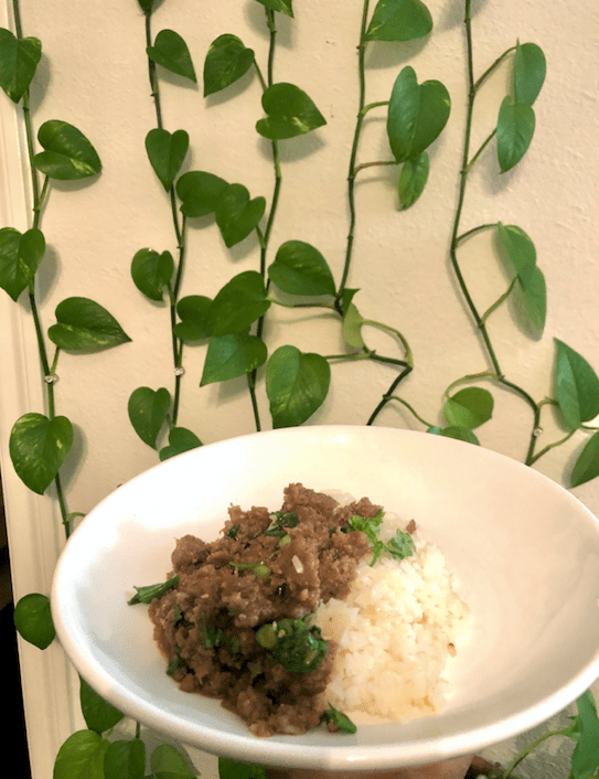 How to – In a pan, heat the oil and sauté the onions, Thai peppers and garlic, add a pinch of salt, on medium heat. Once, the onions are soft, add the ground pork and ginger paste. Mix together and let it sauté for another 4 minutes. Add the soy sauce, ginger powder, and broth. Cover with a lid and let cook for 15 minutes. Then add the green onions and as many sesame seeds as you like. Cook for another 6 minutes. At this point you will smell the gingery fragrance off it!