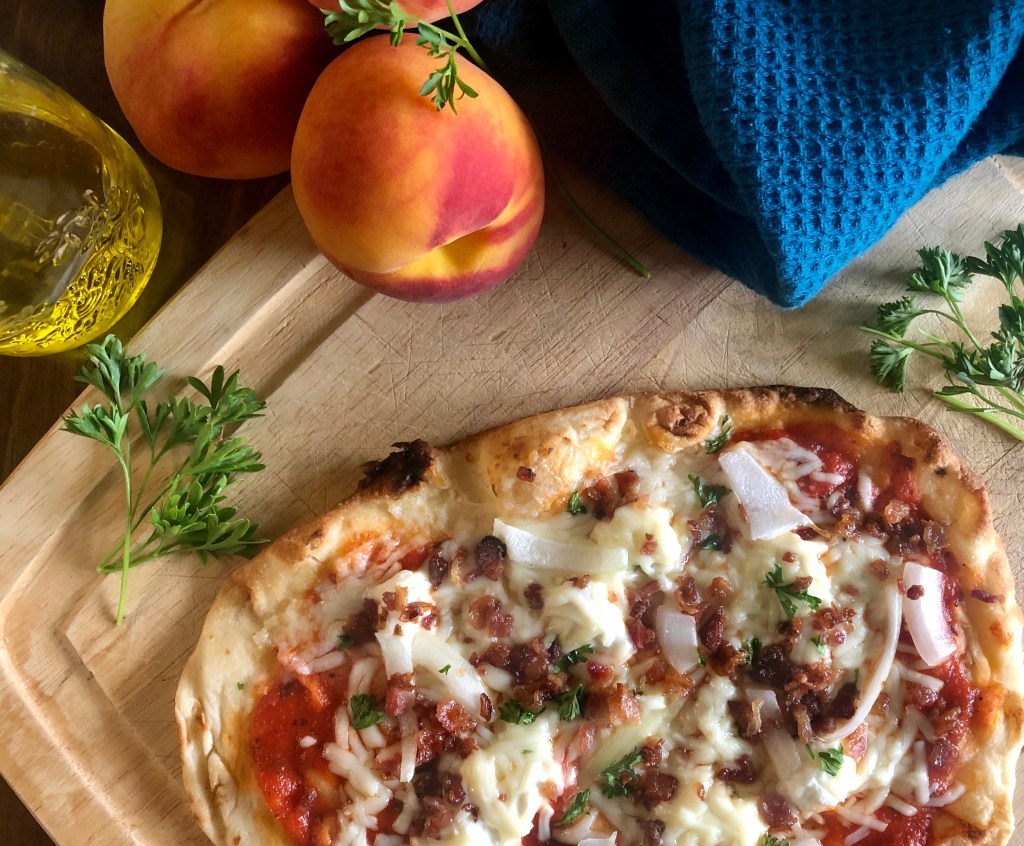 What you will need (per serving one pizza) : Ready-to-eat Naan (you can find this at most stores, its just an Indian flatbread that’s SO DELISH) Olive oil Ground black pepper Salt 3 tbs marinara sauce 3-4 tbs ranch dressing (hidden valley or one you prefer) 1 cup shredded mozzarella cheese A handful of shredded cheddar, parmesan or even ricotta cheese 1/4 cup chopped white onion Some bacon bits Parlsey to sprinkle on top