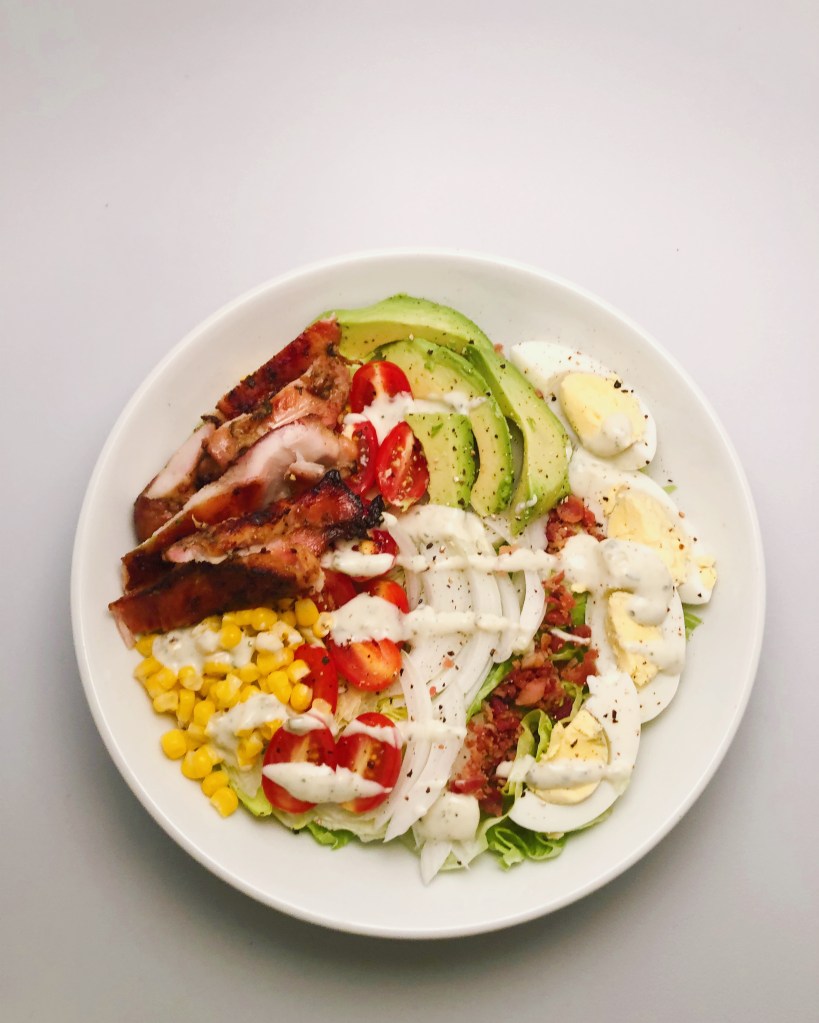 How to – Mix some salt and pepper into to the pepper. Put it in a bowl, and then start layering with tomatoes, corn, avocado, hard boiled egg, bacon, onions, chicken.