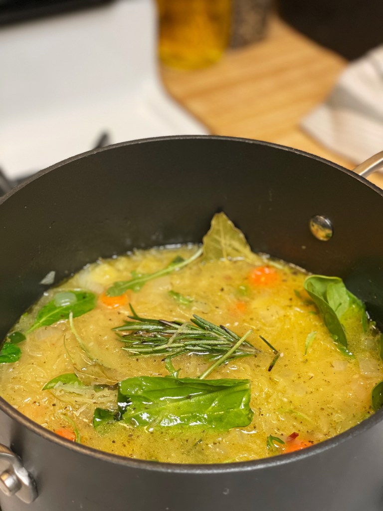 Add your broth, paprika, turmeric, nutmeg and stirr. Add the water and chicken bouillon. Add your rosemary. Bring to a boil. And add your spinach. Stir, cover with a lid and simmer on medium low heat for about 15-20 minutes. Enjoy!